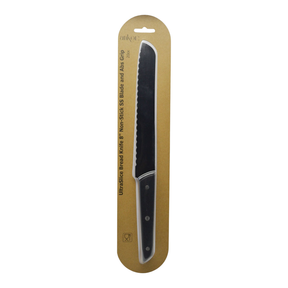 Μαχαίρι ψωμιού με λεπίδα μήκους 20εκ., ιδανικό για εύκολο κόψιμο ψωμιού και αρτοσκευασμάτων χωρίς να θρυμματίζονται. Διαθέτει αντικολλητική επίστρωση που αποτρέπει την προσκόλληση, προσφέροντας καθαρή και άνετη κοπή. Η εργονομική λαβή από ABS εξασφαλίζει σταθερό και ασφαλές κράτημα, καθιστώντας το κατάλληλο για καθημερινή χρήση στην κουζίνα.