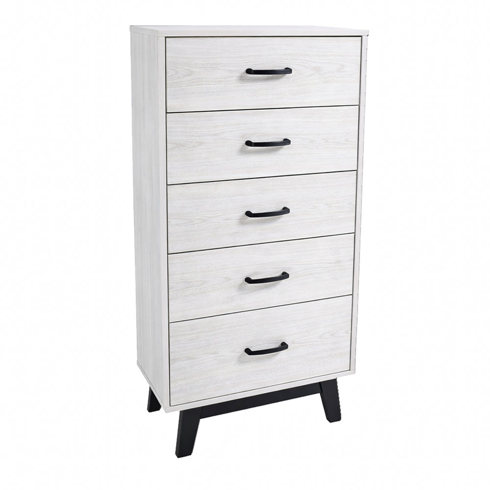 Συρταριέρα με μοντέρνο σχεδιασμό σε λευκή απόχρωση ξύλου, που ταιριάζει εύκολα σε κάθε χώρο. Διαθέτει πέντε ευρύχωρα συρτάρια με εξωτερικό ύψος 13εκ. εσωτερικό 11εκ., ιδανικά για την αποθήκευση ρούχων και άλλων αντικειμένων. Τα μαύρα χερούλια και τα πόδια δημιουργούν μια κομψή αντίθεση, ενώ η σταθερή κατασκευή εξασφαλίζει αντοχή και μεγάλη διάρκεια στον χρόνο. Αποτελεί ιδανική επιλογή για υπνοδωμάτιο ή καθιστικό.